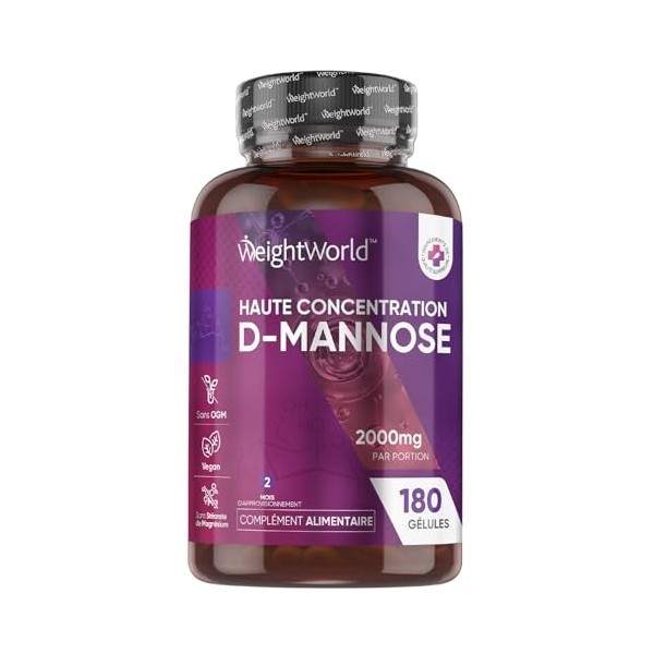 GÉLULES DE D MANNOSE - WeightWorld a spécialement conçu pour vous un complément enrichi de 2000mg de D-Mannose par portion quotidienne. Notre D-Mannose poudre en gélules contient des ingrédients d'origine naturelle. Profitez dès maintenant de nos 180 gélules pour 2 mois d'approvisionnement !
