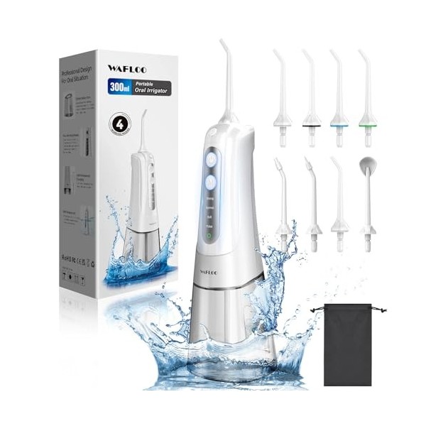 WAFLOO Hydropulseur dentaire sans fil : Irrigateur buccal 8 jets 4 modes portable, réservoir de 300 ml, rechargeable par USB,