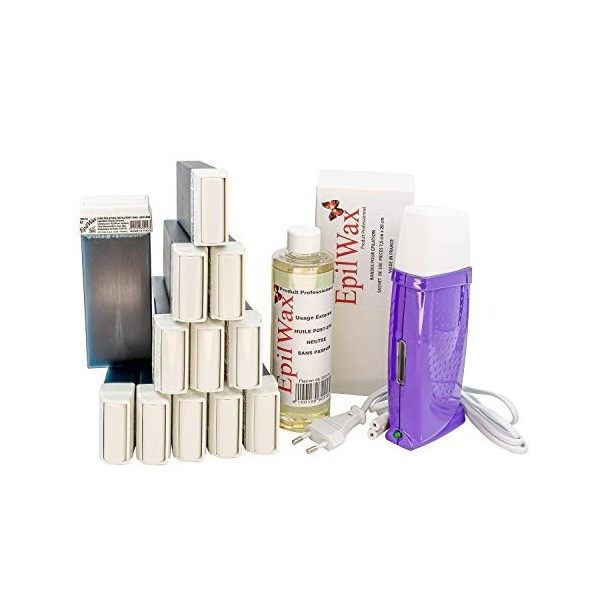 EpilWax Kit dÉpilation Royal Complet avec : chauffe cire professionnelle,12 Roll-On de cire 100 ml à l’Azulène, 100 bandes é