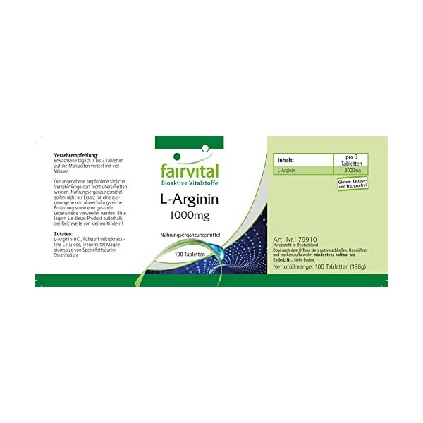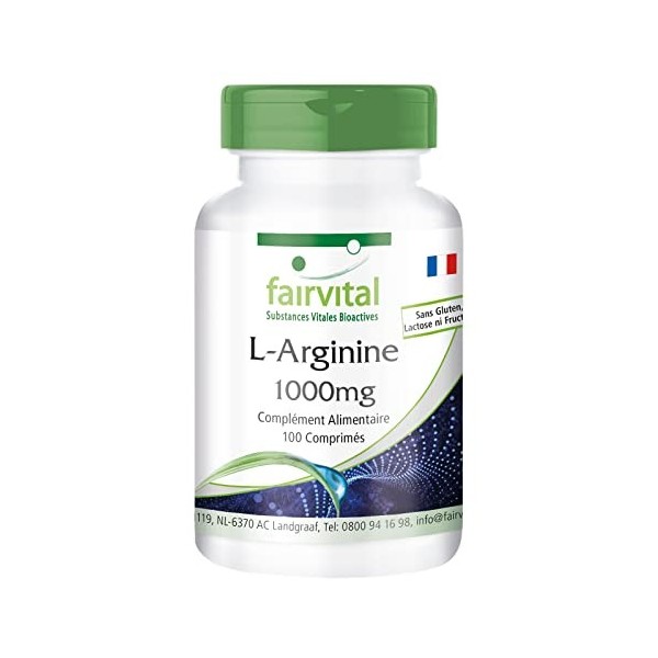 ✔ Fairvital QUALITÉ ALLEMANDE : dose journalière: 1 comprimé par jour contenant de la L-arginine 1000 mg. Dosages élevés! Excellent rapport qualité prix!
