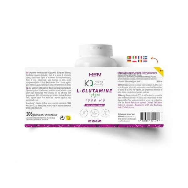 HSN Glutamine en Capsules Kyowa Quality® | 180 Capsules Végétales | 4 grammes de L-Glutamine par Portion Quotidienne | Qualit