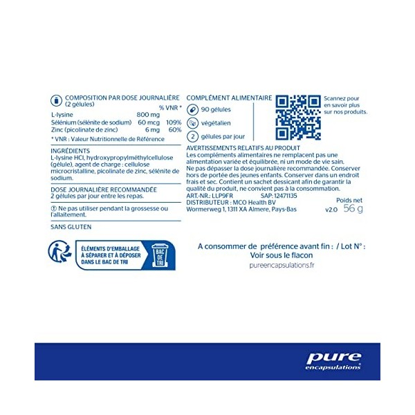 Pure Encapsulations - L-Lysine Plus - Acide Aminé Essentiel avec Sélénium & Zinc - Supplément Hypoallergenique - 90 Gélules V