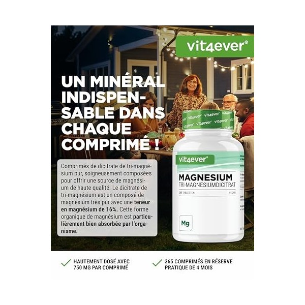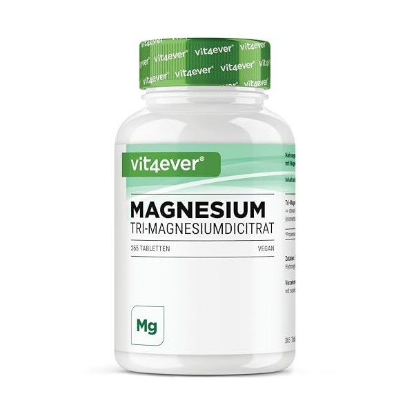 RÉSERVE POUR 4 MOIS : 365 comprimés végétaliens particulièrement bien dosés avec 2250 mg de tri-magnésium dicitrate pur par portion journalière (3 comprimés), dont 360 mg de magnésium élémentaire. Réserve pratique de 4 mois en cas de prise de 3 comprimés par jour.