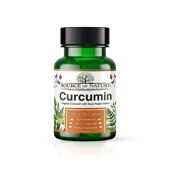 Source of Nature® | Extrait de Curcuma 500mg | 60 Capsules | +95% Curcuminoïdes | Produit dans lUE | Avec BioPerine® Extrai