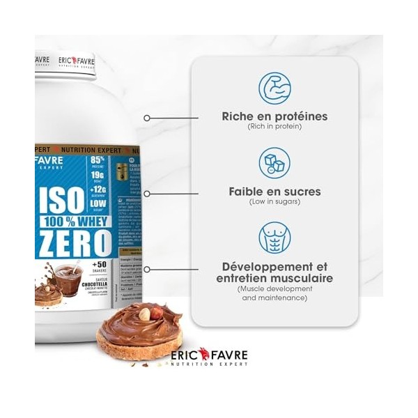 ISO ZERO 100% Whey Isolate contient + de 85% de protéine. Cette protéine Whey est 100% Isolate whey protein (WPH, WPI), l’une des plus pures sources de protéines, obtenue à partir de la production de fromage doux. Le laboratoire Eric Favre l’a sélectionné pour son assimilation rapide favorisant le développement musculaire. Dilution parfaite, texture crémeuse et gourmande, faible teneur en sucres !
