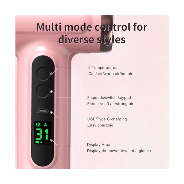 Chargement USB : le sèche-cheveux sans fil est équipé d'une batterie au lithium de 15 000 mAh. Cette conception innovante vous permet d'utiliser le sèche-cheveux à tout moment et en tout lieu sans avoir besoin d'une prise de courant.