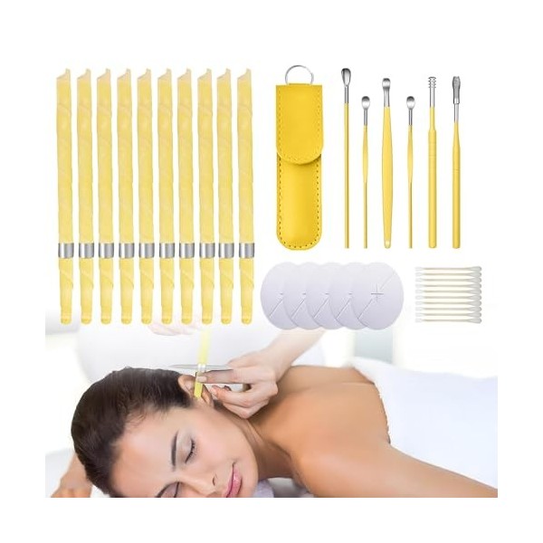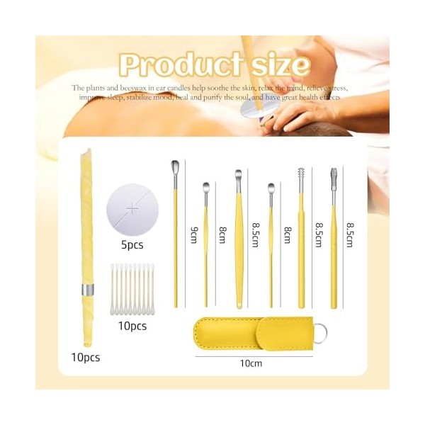 Kit Complet d'Entretien des Oreilles: Ce pack comprend 10 bougies pour oreilles, 5 plaques de bougie, 10 cotons-tiges et 6 cuillères à oreille en acier inoxydable, fournissant tout ce dont vous avez besoin pour un nettoyage complet des oreilles.