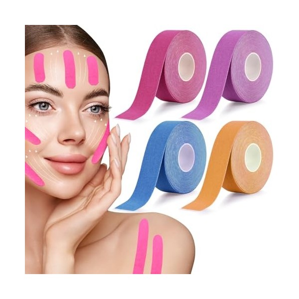 【Disponible en 4 Couleurs】Le paquet contient 4 rouleaux de 2.5cm x 5m/0.98in x 196in face lifting tape en 4 couleurs différentes, violet, orange, rouge et bleu. Les scotch anti rides visage sont disponibles dans une variété de couleurs, vous pouvez donc choisir selon vos préférences ou les partager avec vos amis et votre famille.
