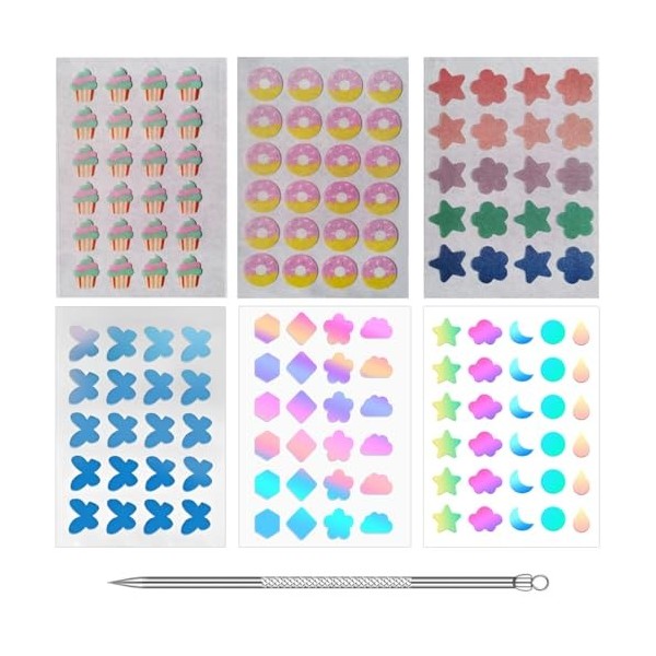 Détails de l'emballage : Il y a 6 styles différents de extracteur point noir, un total de 6 feuilles (142pcs) de patchs d'acné et 1 outil d'élimination des points noirs et de l'acné pour l'acné combo set. Élimine les boutons et l'acné, prévient et réduit le risque de décoloration et de cicatrisation.