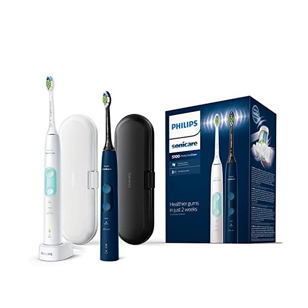 Philips Sonicare ProtectiveClean 5100 Lot de 2 brosses à dents électriques, Capteur de pression intégré, 3 modes, 2 étuis de