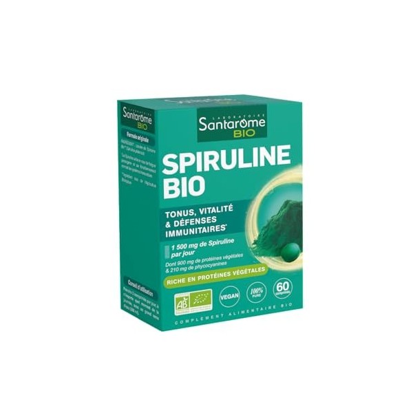 Santarome Bio - Spiruline Bio | Jusquà 19% de Phycocyanine | Riche en Protéines, Fer & Vitamine B12 | 60 comprimés de 500mg
