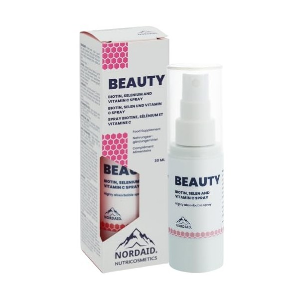 TOUT-EN-UN POUR LES CHEVEUX, LA PEAU ET LES ONGLES - Le Beauty Spray de Nordaid fournit une combinaison de biotine, de sélénium et de vitamine C. La biotine favorise le maintien de cheveux et d'une peau sains, tandis que le sélénium aide à maintenir des cheveux et des ongles normaux. La vitamine C contribue à la formation normale de collagène et soutient le fonctionnement régulier de la peau.