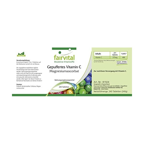 Fairvital | Vitamine C comme lascorbate de magnésium - boite de 8 mois - VEGAN - 240 comprimés - facile sur lestomac